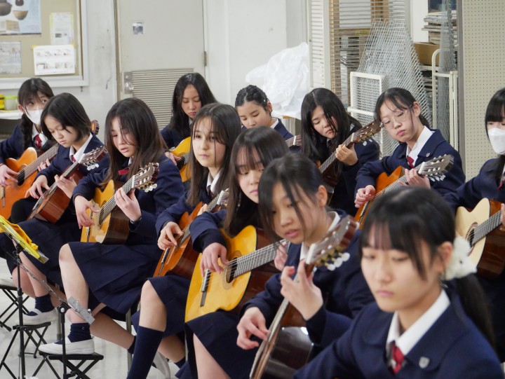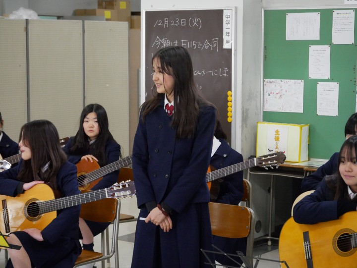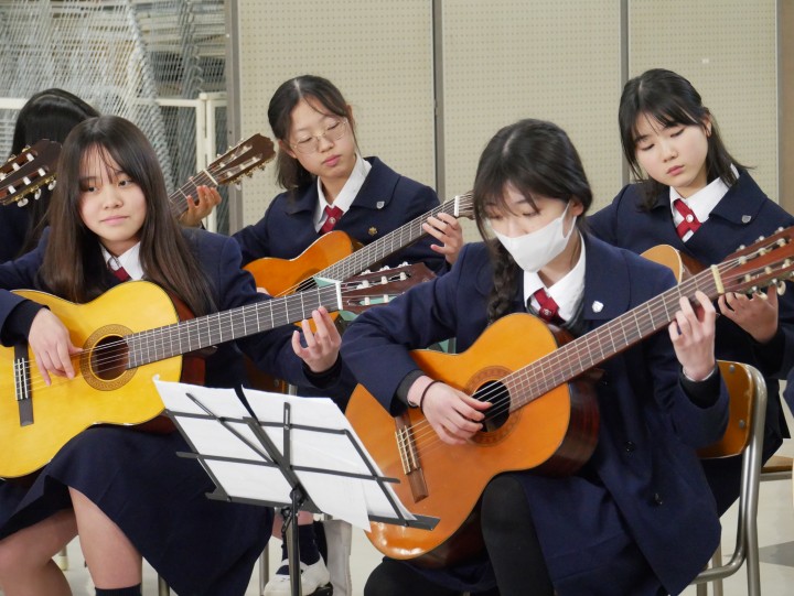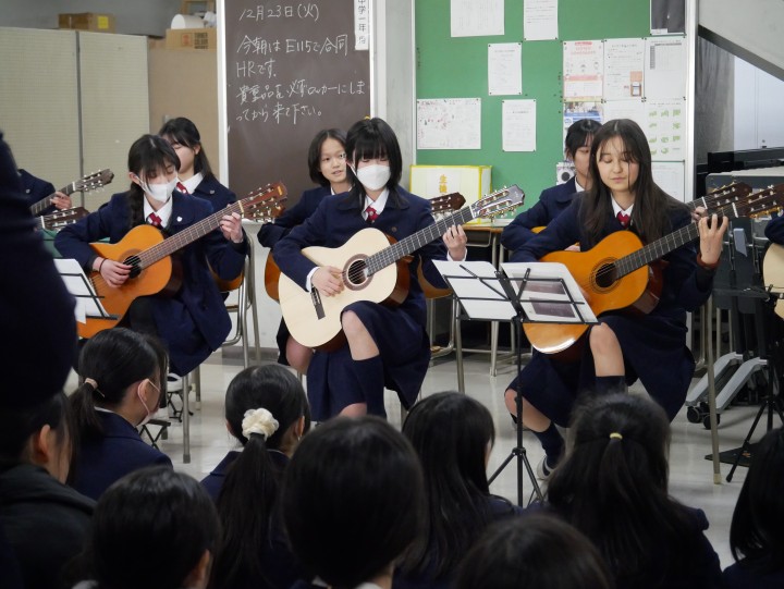 12月23日の昼休みに、Aブロックのロビーでギター部クリスマスコンサートが行われました。伝統曲として弾き継がれている「GAVOTTE」に加え、J-POPの名曲や定番のクリスマスソングを演奏し、聴きに来た多くの生徒や先生たちを楽しませてくれました。