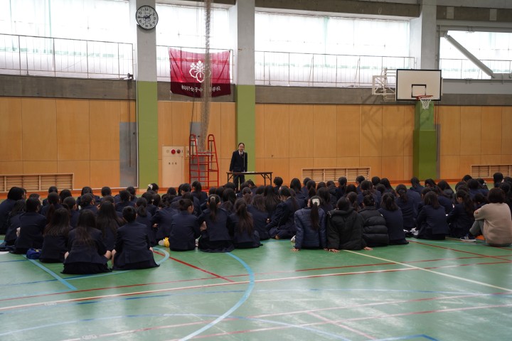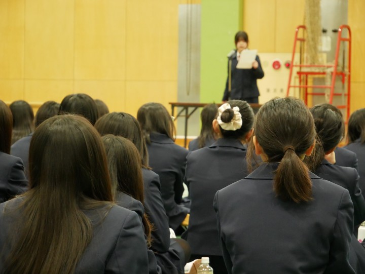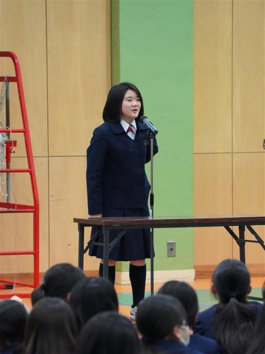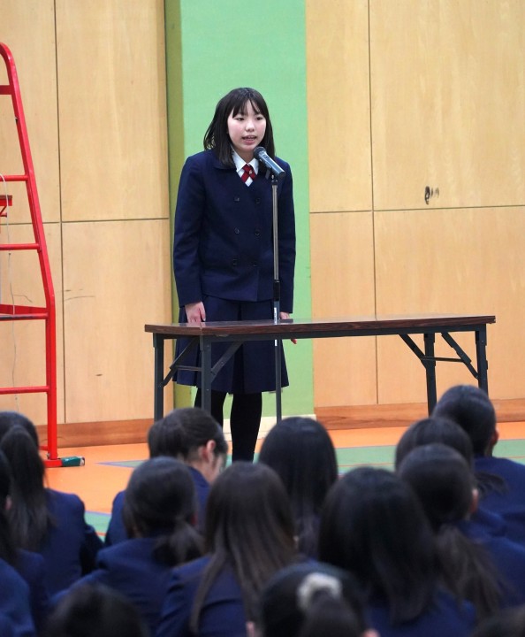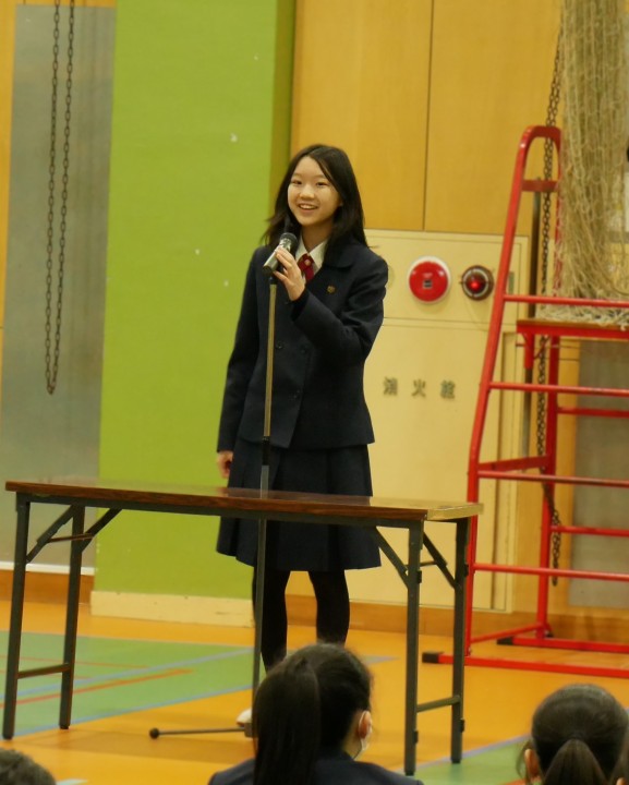 授業での発表を経て各クラスから選出された総勢14名のスピーチを、中1の生徒、それに学年教員みんなで聴き、様々な意見や考え方を分かち合いました。発表者の熱意と、聞き手の温かい気持ちがひとつになった実りある発表会となりました。