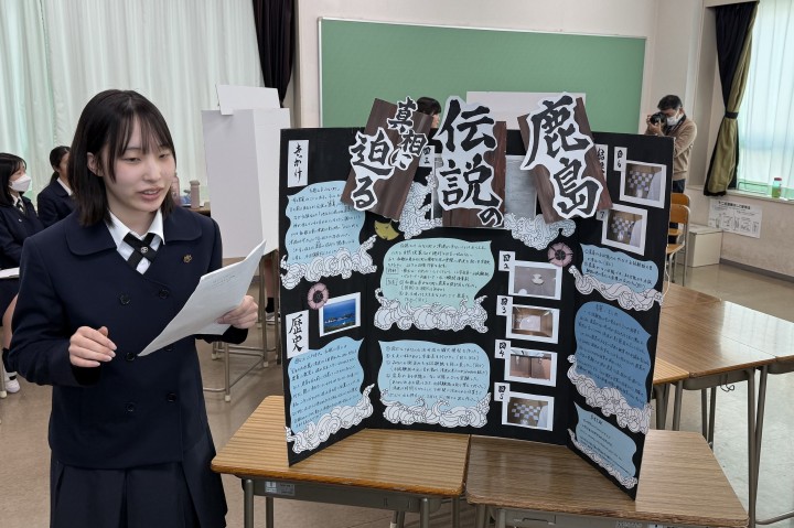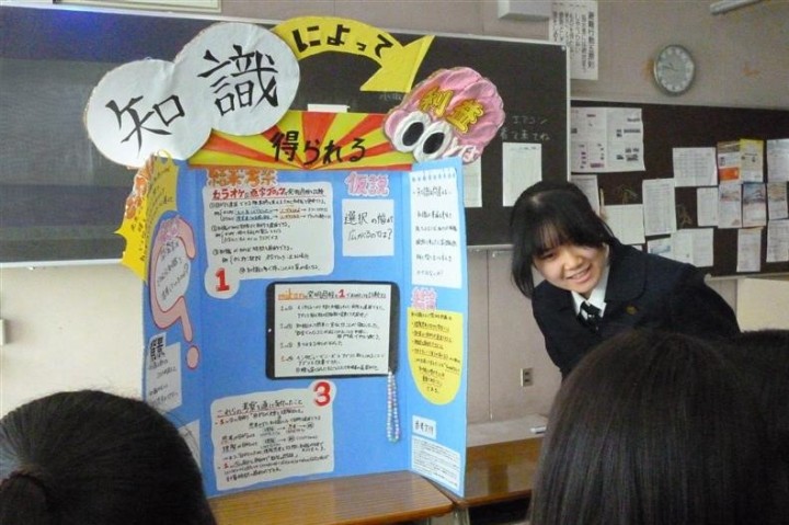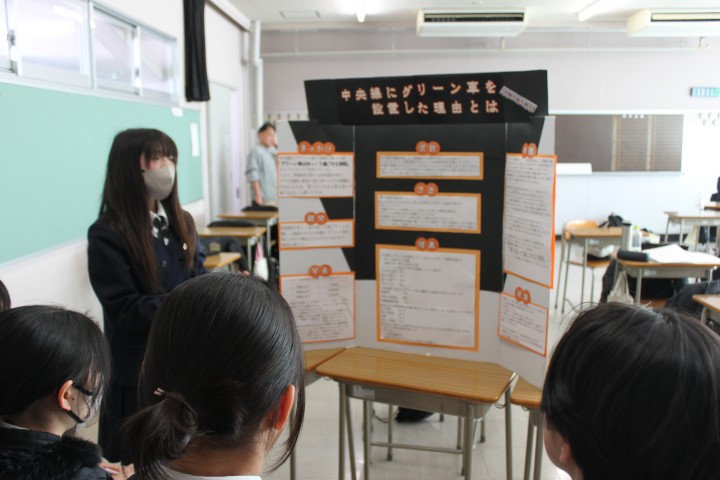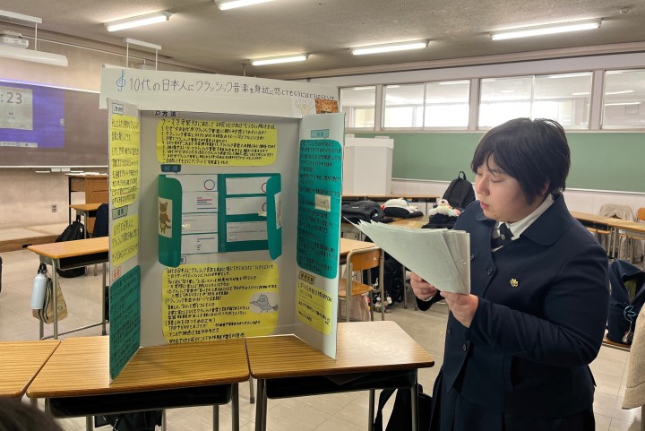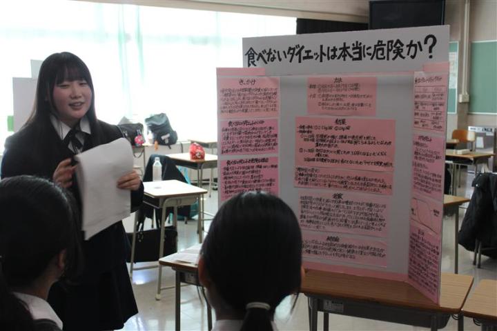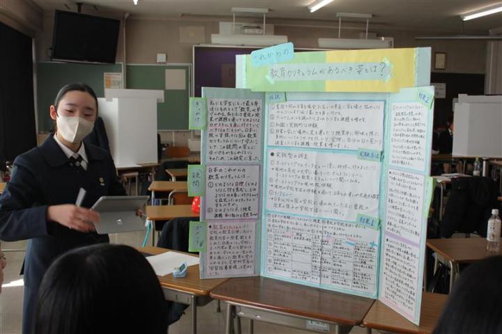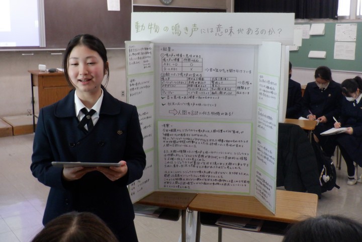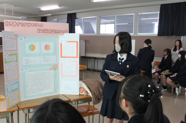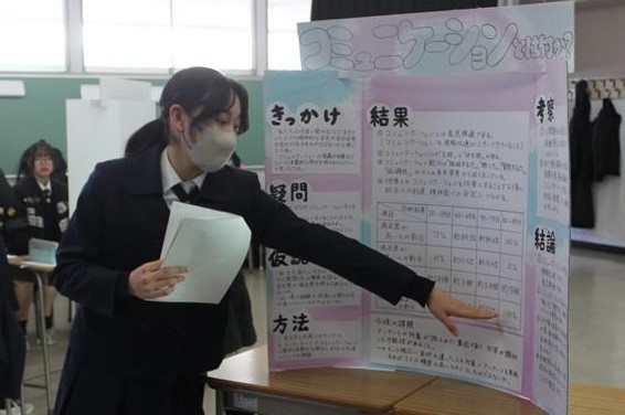 発表にあたり、聴き手にアピールポイントが伝わるよう工夫して制作したプレゼンテーションボードを用いて、各自熱のこもった発表をしました。長期間かけて取り組んだ探究活動の集大成ということもあり、無事発表し拍手をもらった際には、生徒たちは皆達成感を得た様子でした。